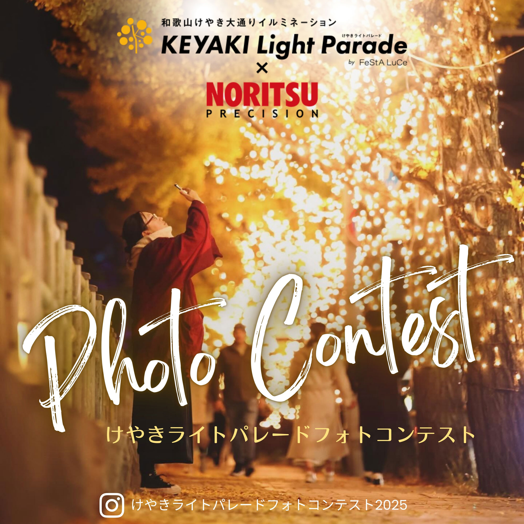 ノーリツプレシジョン(株)のアカウント@noritsu_precision_photos と和歌山けやき大通りイルミネーション実行委員会のアカウント @keyaki_light_parade をフォローして、フォトコンテストに参加しよう!