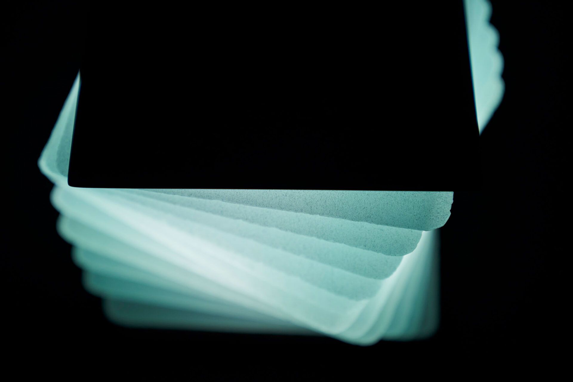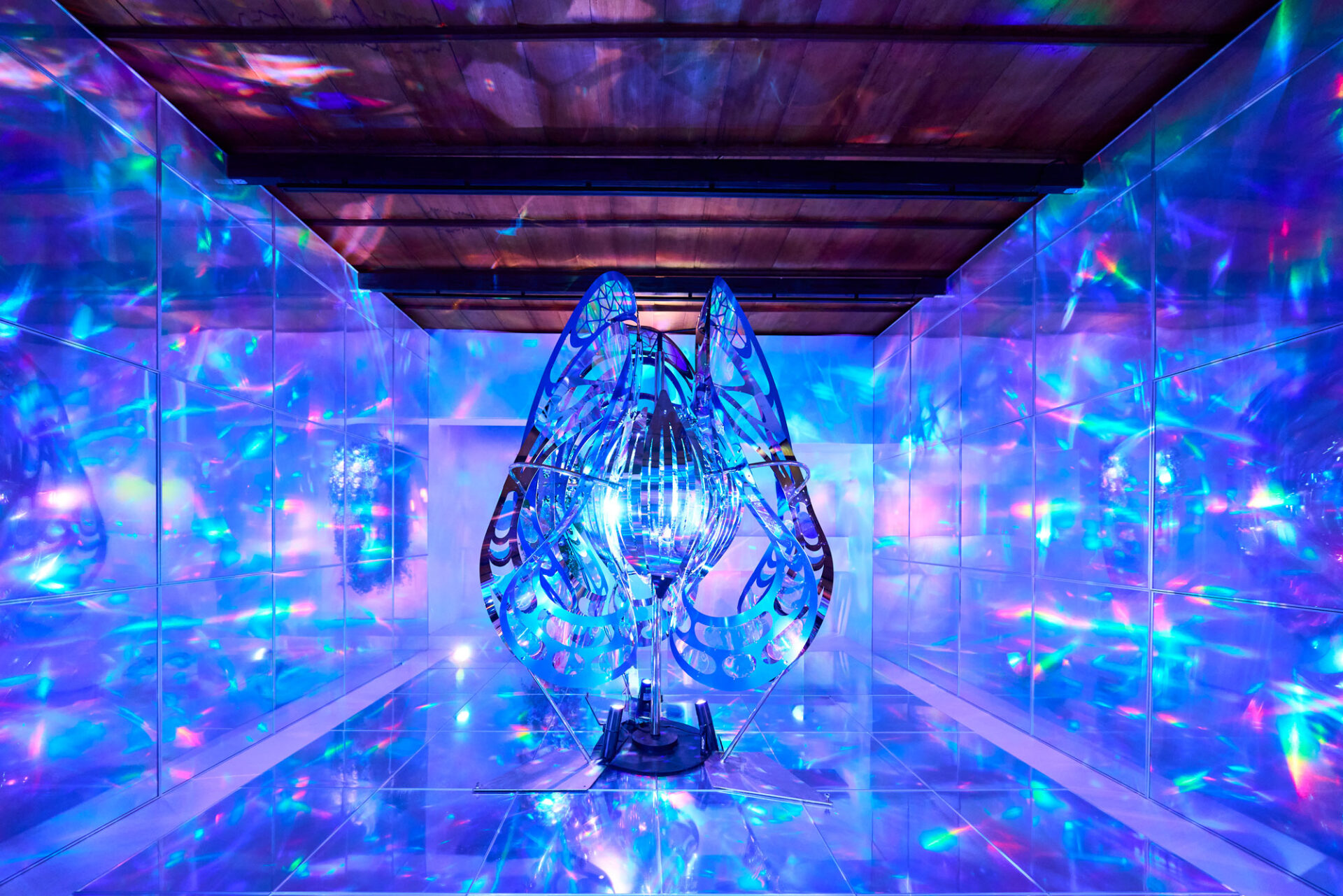 富山市は、「富山のくすり」に代表される商人文化と産業の町として発展し、明治・大正期には薬瓶製造を背景にガラス産業が集積した都市です。その歴史を礎に、市は「ガラスの街とやま」を掲げ、育成・制作・鑑賞の拠点を整備してきました。ガラス作家・小路口力恵氏は、こうした土地の文脈に根差し、素材がもつ色と透明感を探究しています。作品《MIAKARI-kasane》は、雪に覆われる富山の静謐な風景を想起させる青い光を重ね、日本人が自然と共に育んできた灯りの感覚を、現代ガラス表現として結晶させた作品です。