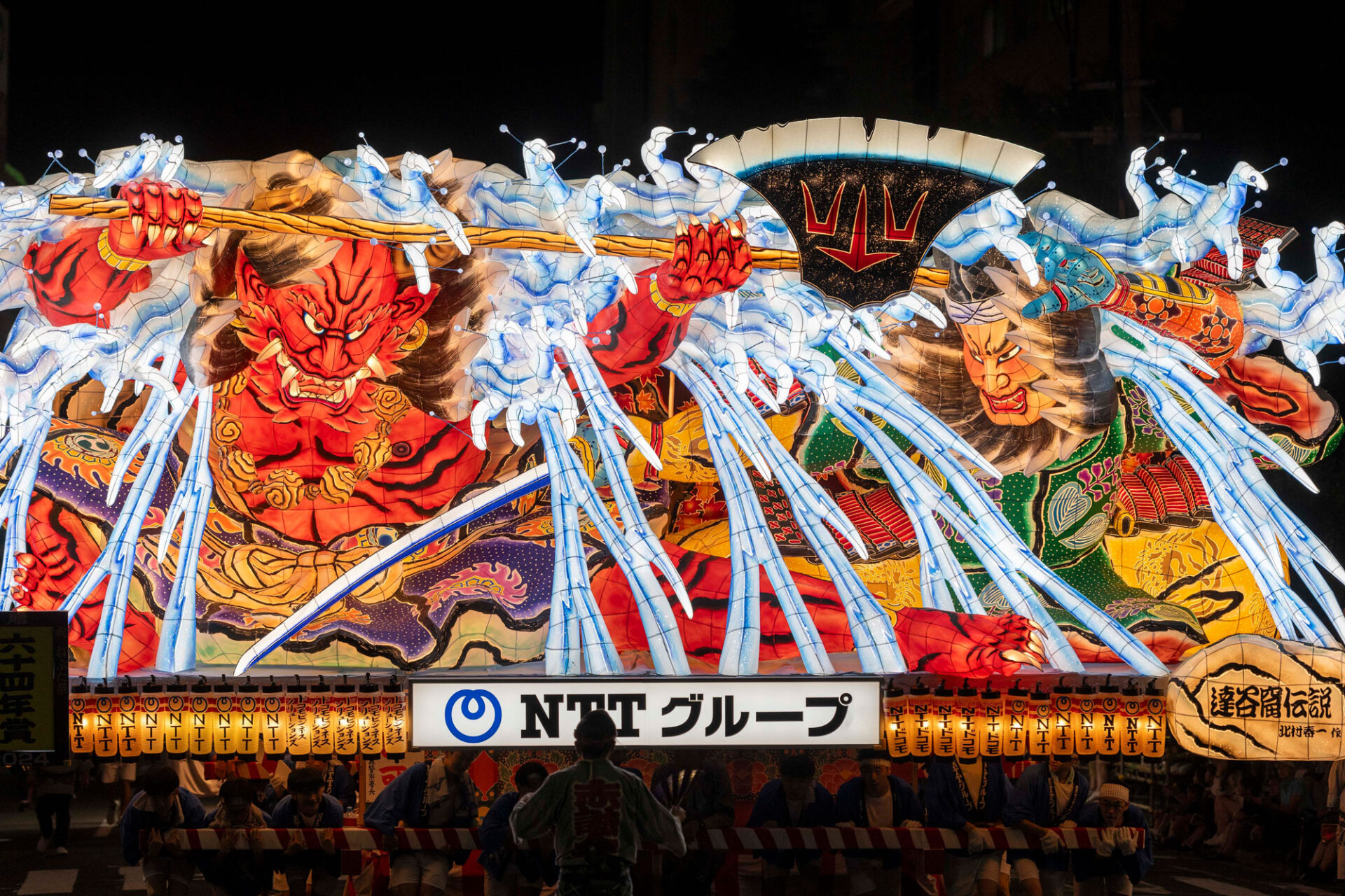 青森市は、陸奥湾に面した港町として人と文化が行き交い、港の力をもって成長し、歴史を刻んできた“まち”です。青森ねぶた祭は、七夕祭りの灯籠流しの変形であろうといわれ、歌舞伎や歴史・神話を題材にした「ねぶた」、色とりどりの衣装を身にまとい乱舞する「跳人(はねと)」、笛や太鼓、手振り鉦などの心に焼き付く音色で聴衆を魅了する「囃子方」がともに青森の街を練り歩きます。展示作品《達谷窟伝説》は、岩手県・達谷窟に伝わる英雄譚を題材に、ねぶた師・北村春一氏が青森ねぶたの技法と精神によって現代的造形として昇華させた作品です。