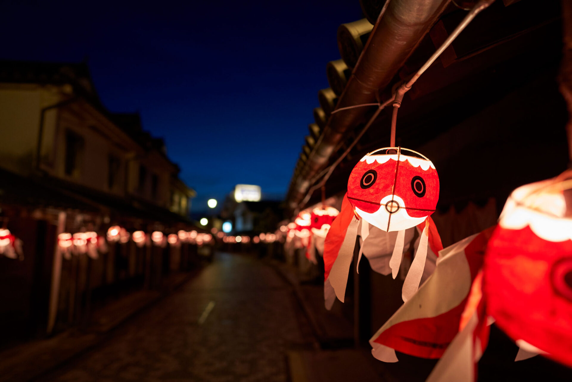 山口県柳井市は、瀬戸内海に面した商都として栄え、白壁の町並みに商人文化が息づくまちです。その歴史的景観を舞台に開催されるのが「柳井金魚ちょうちん祭り」です。祭りの象徴である柳井金魚ちょうちんは、幕末に北前船を通じて津軽の金魚ねぷた文化が伝わり、柳井の商人・熊谷林三郎が柳井縞の染料など地場の技を取り入れて生み出した郷土民芸品です。年に一度の祭りでは約2,500個の金魚ちょうちんが灯り、金魚ねぶたの山車が練り歩くことで、商都・柳井ならではの交流の歴史と灯りの文化が幻想的に表現されています。