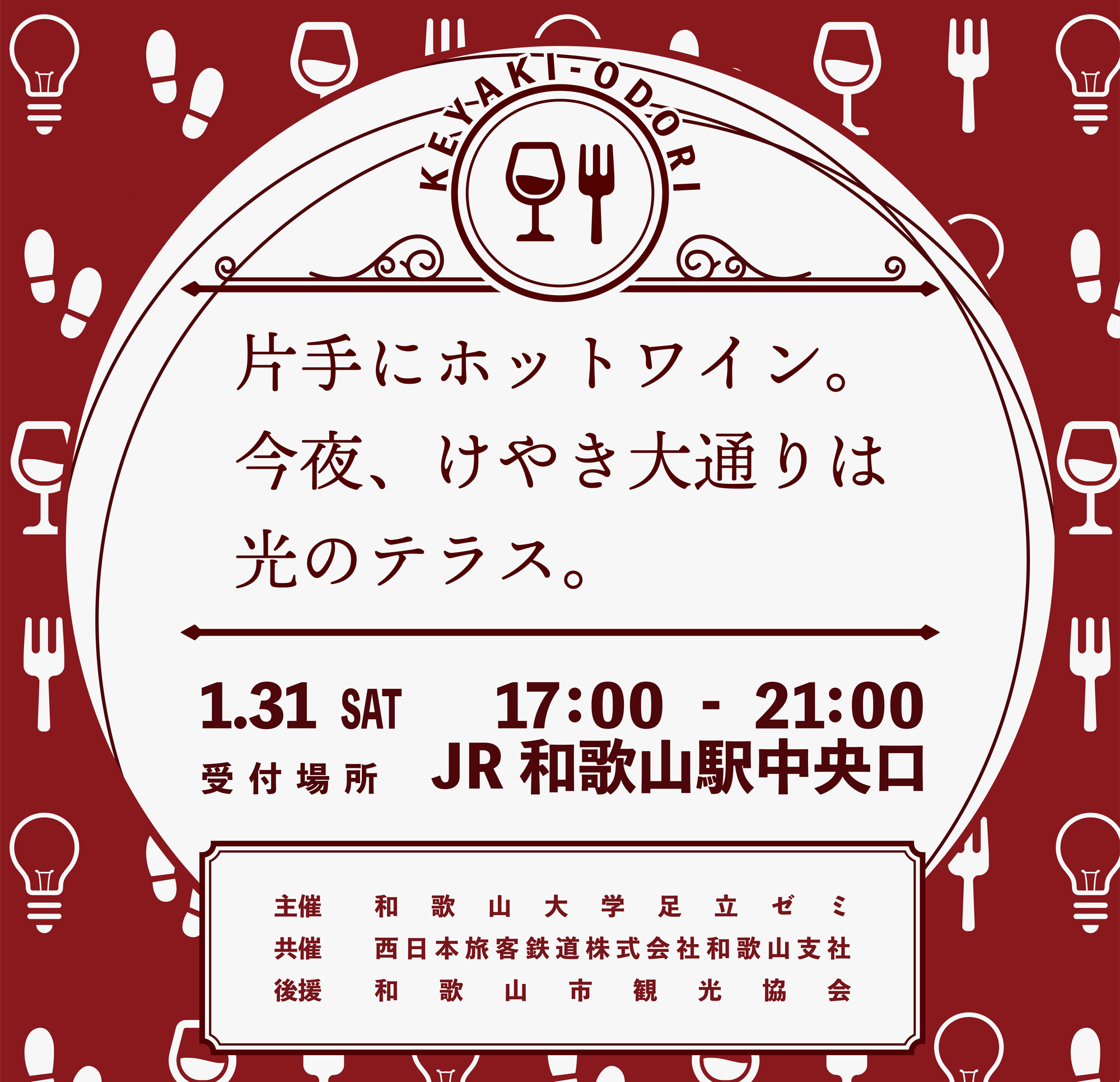 本イベントは、和歌山市の中心市街地を彩るイルミネーション「KEYAKI LIGHT PARADE」に合わせ、 「車で通り過ぎる景色を、歩いて楽しむ体験へ」をコンセプトに企画しました。参加者は受付でスター ターキット(ドリンク、マップ、周遊チケット等)を購入し、ホットワイン等のドリンクを片手に、学生 がセレクトした「おすすめスポット」や提携店舗を巡ります。